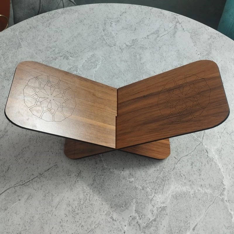 اندازه هر قطعه 12 در 30 سانتیمتر امکان استفاده ی دو طرفه برای قرآن های بزرگ وکوچک امکان تغییر اندازه امکان تغییر رنگ امکان تغییر طرح روی رحل